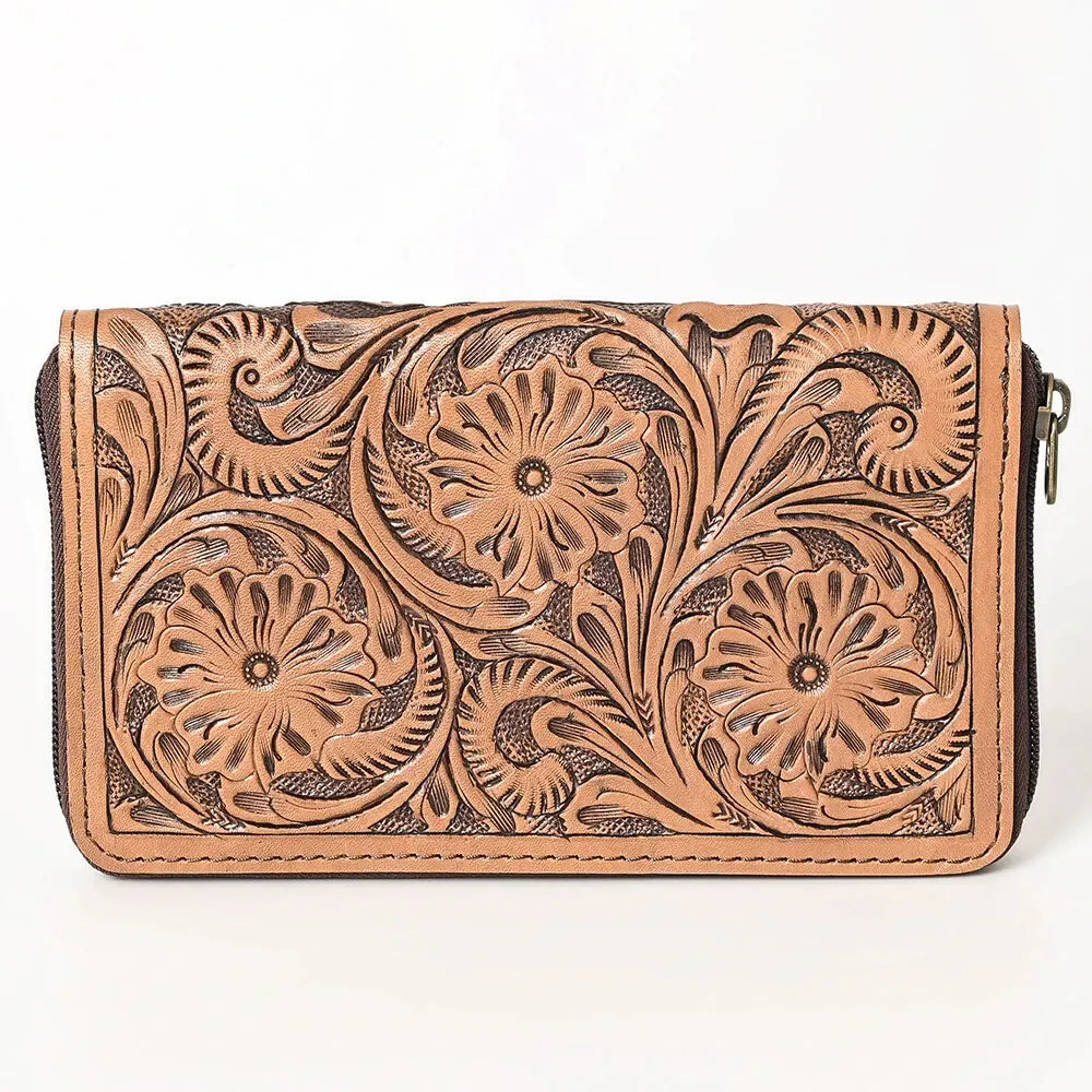Sorgfältig gefertigt mit einem faszinierenden Western-Thema. Diese Tasche ist handgefertigt aus echtem Rindsleder, das fachmännisch punziert, handgeschnitzt und schließlich antikisiert wurde. Jedes Detail zeugt von der Kunstfertigkeit erfahrener Handwerker