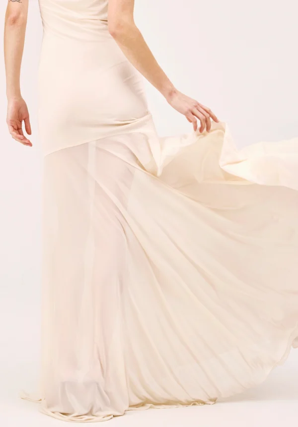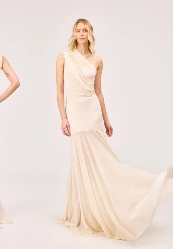 Dieses One-Shoulder-Kleid von ATLEIN in Elfenbein verkörpert die raffinierte Balance der Marke zwischen Sinnlichkeit und skulpturaler Fluidität. Gefertigt aus weich fließender Viskose, umspielt es den Körper mit müheloser Eleganz, betont die Silhouette und bewahrt dabei eine luftige, ausgesprochen feminine Bewegung. Der Rock ist dezent halbtransparent und verleiht dem Kleid eine zarte, ätherische Leichtigkeit, die seine abendliche Ausstrahlung veredelt und seinen subtil verführerischen Charakter unterstreicht. Eine Studie in Reinheit, Fließkraft und zurückhaltender Raffinesse – ein leuchtendes Statement mit eindrucksvoller Präsenz.