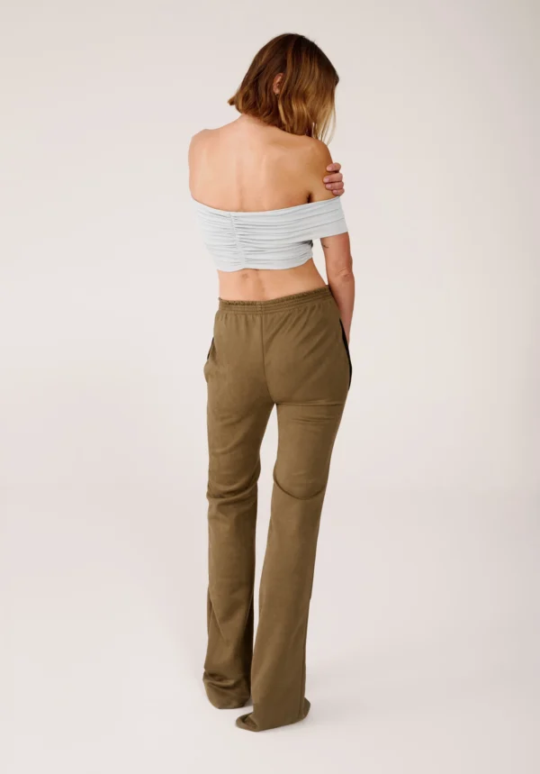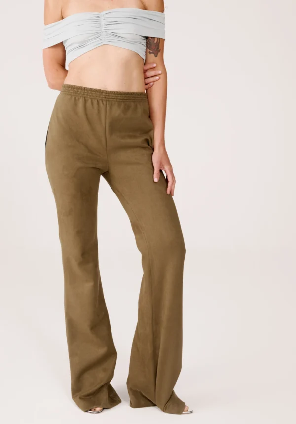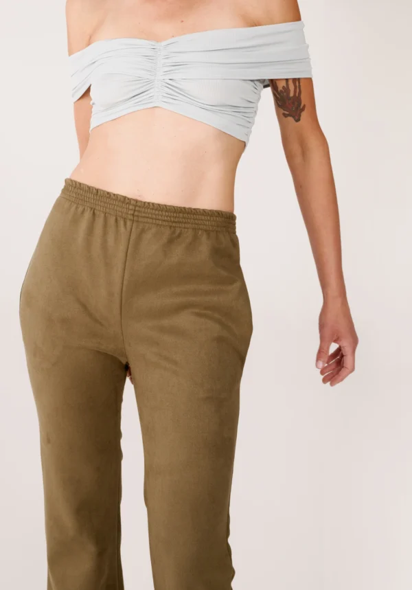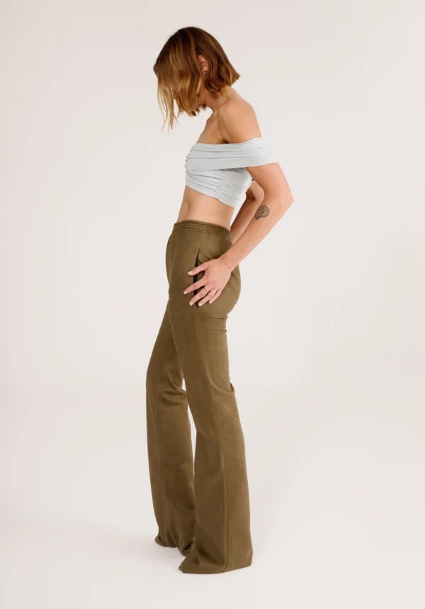 Diese Hose in Khaki von ATLEIN verkörpert Pariser Stil und raffinierte Eleganz. Mit einem elastischen, komfortablen Bund und einem leicht ausgestellten Bein verbindet sie lässige Leichtigkeit mit moderner, femininer Note. Die samtartige Textur verleiht dem Modell einen luxuriösen Charakter und macht es zu einem vielseitigen Begleiter für jede stilvolle Garderobe.