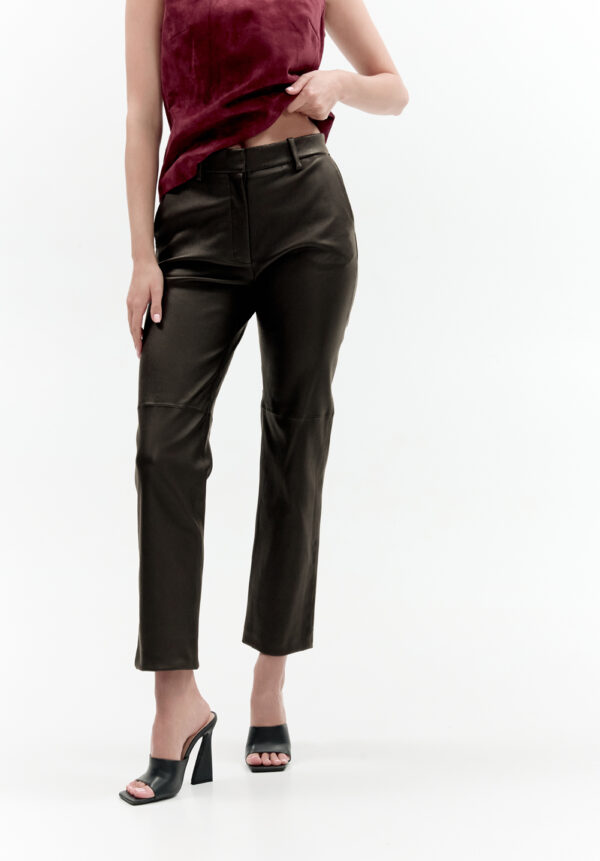 Die Hose „Jojo“ von ENES ANTWERP aus naturbelassenem Lammleder steht für raffinierten Stil und moderne Eleganz. Ihre taillierte Passform betont die Silhouette, während der hohe Bund die Taille dezent formt und gleichzeitig für optimalen Tragekomfort sorgt. Das weiche Stretchmaterial garantiert perfekten Sitz und vereint luxuriöse Optik mit Alltagstauglichkeit.