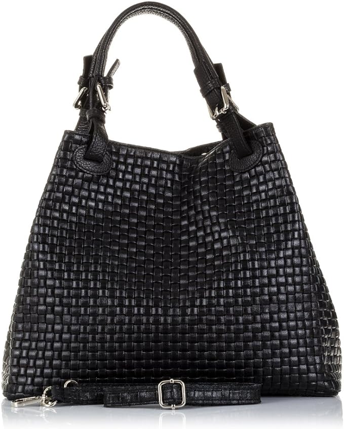 Damenhandtasche aus echtem, in Italien gefertigtem Leder mit Webmuster, breiten Henkeln und einem innenliegenden, verstellbaren und abnehmbaren Schulterriemen, der auch über der Schulter getragen werden kann. Die Tasche wird mit einem Magnetverschluss geschlossen. Zwei mit Stoff bezogene Innenfächer mit je einem Innenfach für Kleinigkeiten und einem Reißverschlussfach sowie ein zusätzliches Reißverschlussfach in der Mitte. Maße: 33 x 17 x 29 cm (Länge x Tiefe x Höhe)