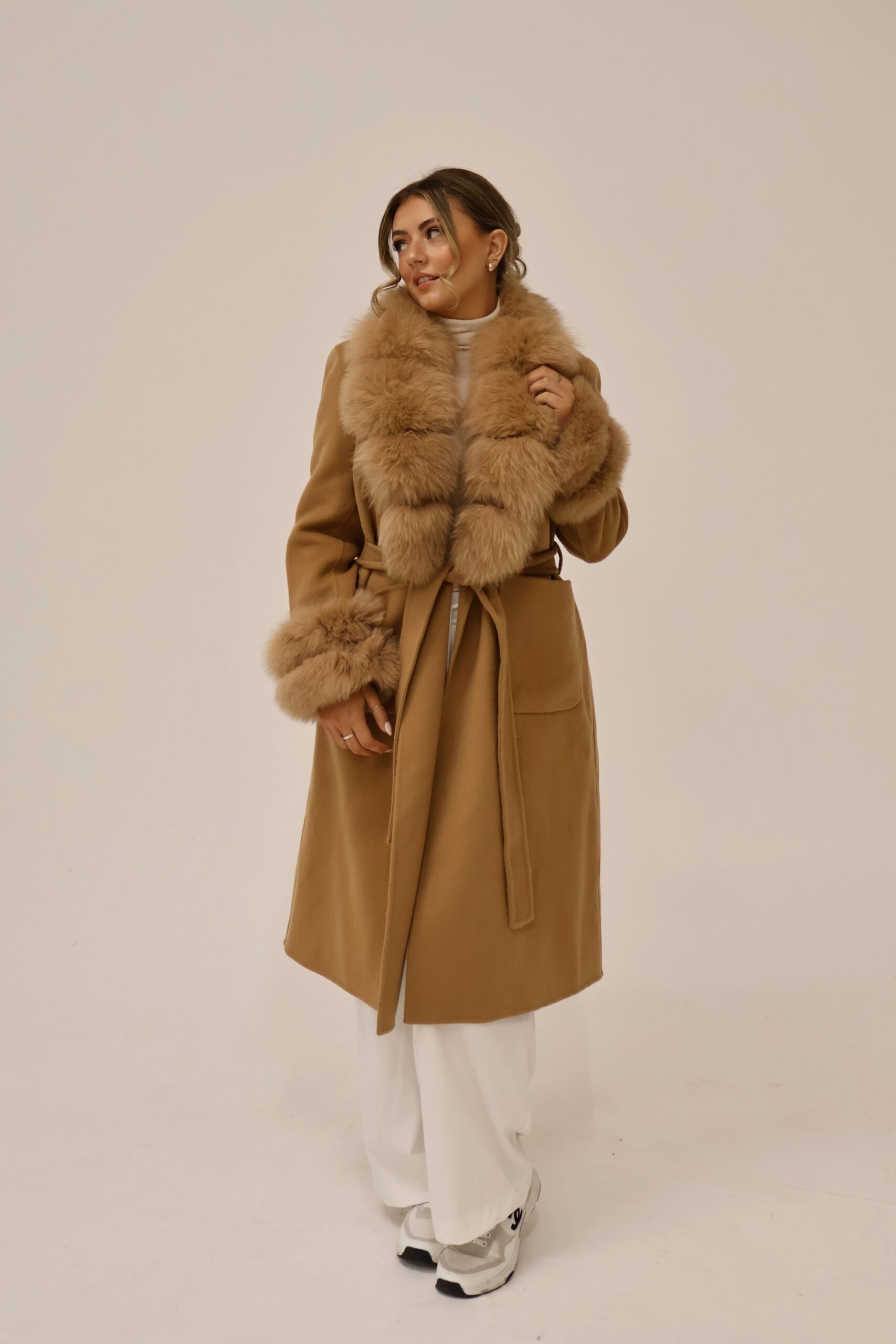 Der Mantel ist mit einem abnehmbaren Kragen und abnehmbaren Manschetten aus 100 % echtem Fuchsfell ausgestattet. Diese Details verleihen dem Modell eine luxuriöse Optik und ermöglichen flexible Styling-Varianten. Je nach Anlass kann der Mantel elegant oder dezent getragen werden.