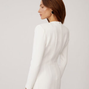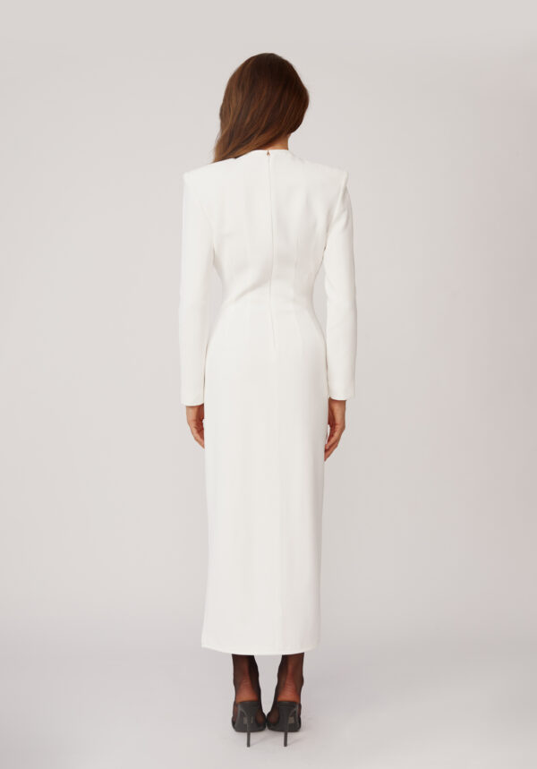 Ein weißes Maxikleid von ROWEN ROSE, das minimalistische Eleganz und architektonische Präzision ausstrahlt. Die schlanke Silhouette wird durch die markanten Schultern betont und verleiht dem Kleid einen Hauch moderner Eleganz. Ein geometrischer Ausschnitt und ein gewagter Schlitz vorne geben genau die richtige Menge Haut preis und schaffen so ein harmonisches Gleichgewicht zwischen Reinheit und Sinnlichkeit. Die schokoladenbraunen Schleifen zieren das Kleid. Dieses Kleid verkörpert raffinierte Schlichtheit mit einem kühnen Twist und ist perfekt für besondere Anlässe und Abende, die nach atemberaubender Eleganz verlangen.