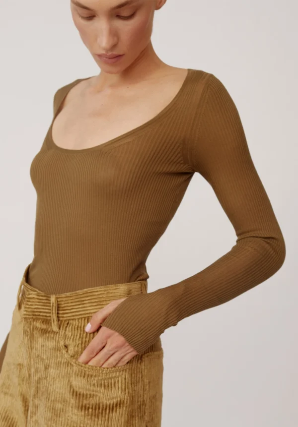 Das „Muse“-Top von PETAR PETROV ist aus feinster Seidengarne gefertigt, und sein federleichter Rippstrick vermittelt ein fließendes, wie eine zweite Haut anmutendes Tragegefühl. Ein tiefer, abgerundeter Ausschnitt rahmt das Dekolleté mit raffinierter Leichtigkeit, während die schmale Silhouette und die langen, eng anliegenden Ärmel – vollendet mit dezenten Daumenöffnungen – eine elegante, feminine Linie formen. Vollständig in Form gestrickt und mit höchster Präzision gearbeitet, vereint es Zartheit mit modernem Esprit. Tragen Sie es zu den Cordhosen „Harbor“ von PETAR PETROV.